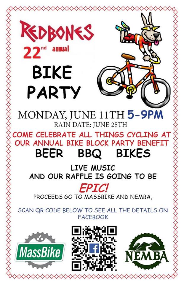 The Redbones bike party is a celebration of all things cycling, benefiting MassBike and the New England Mountain Bike Association (NEMBA). As per the organizers: