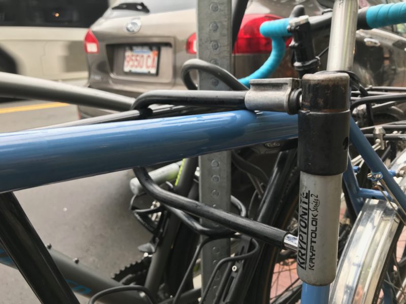 (NEVER lock your bike to another bike…unless your buddy says it’s OK. If so, extra protection for the “inside” bike!)